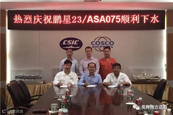 英辉南方陈晓亮总经理陪同深圳市航运集团船技部林仲文总经理一行参加了下水仪式。随后深圳市航运集团船技部林仲文总经理、CCS代表和英辉南方刘勇副总经理共同签署了重要节点文件。