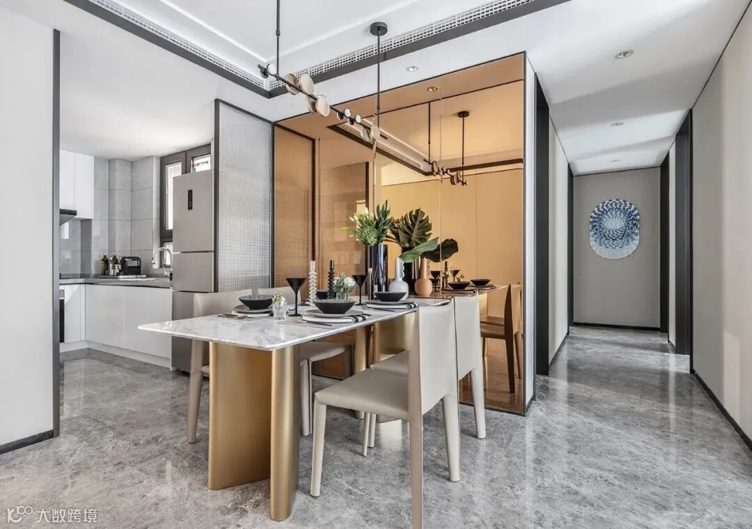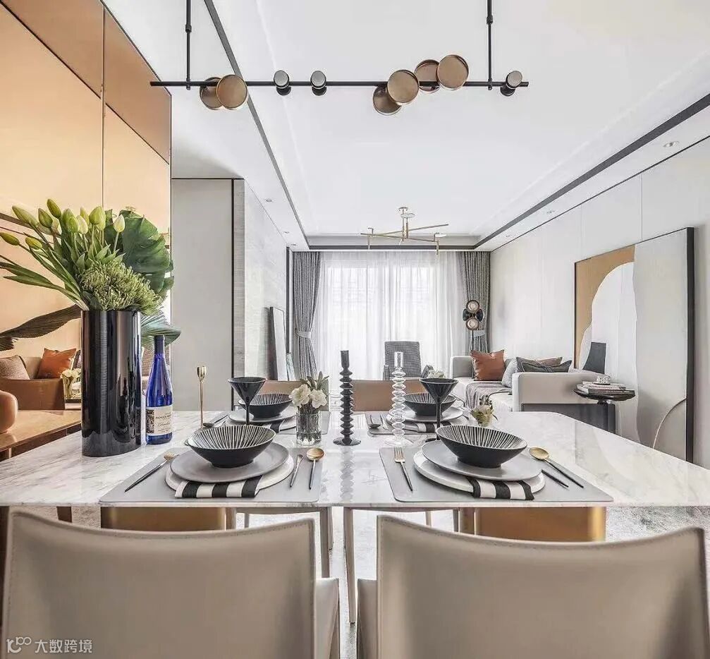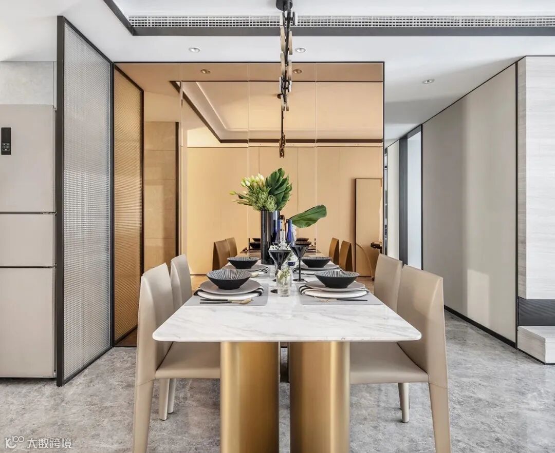 皮质餐椅线条优雅现代,大理石桌面简约不失质感,搭配艺术感的餐具与烛台配饰,油然烘托出一幅精致优雅的生活画卷。餐桌与艺术吊灯材质上与立面呼应,造型也独具巧思,将艺术的美感注入于生活的表里之间。