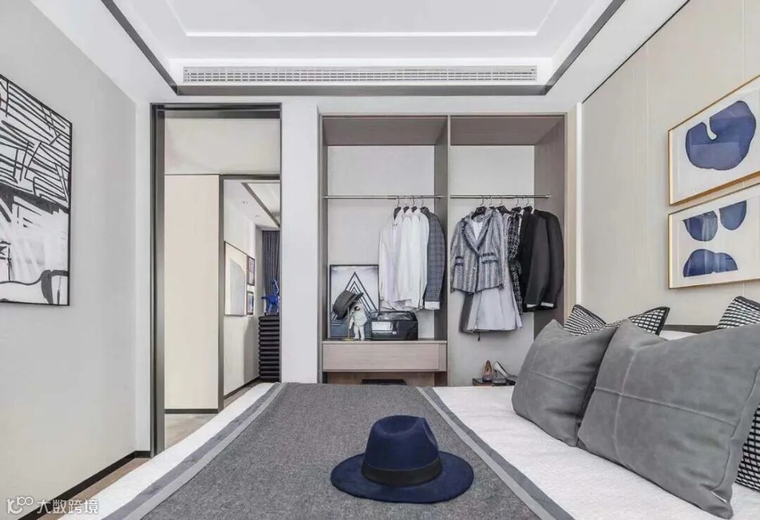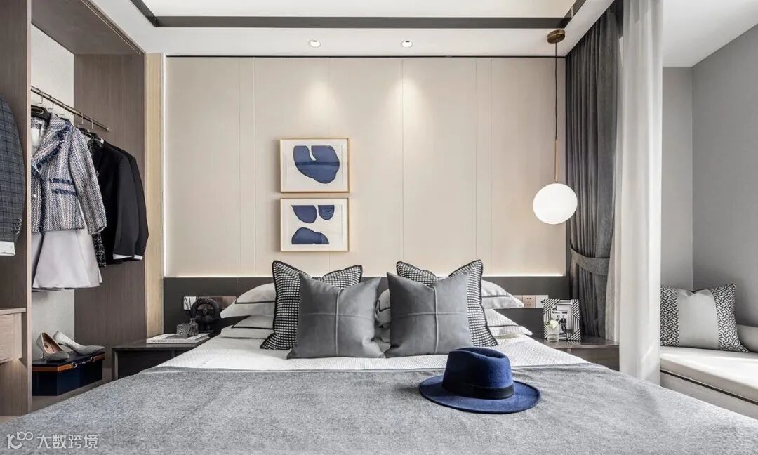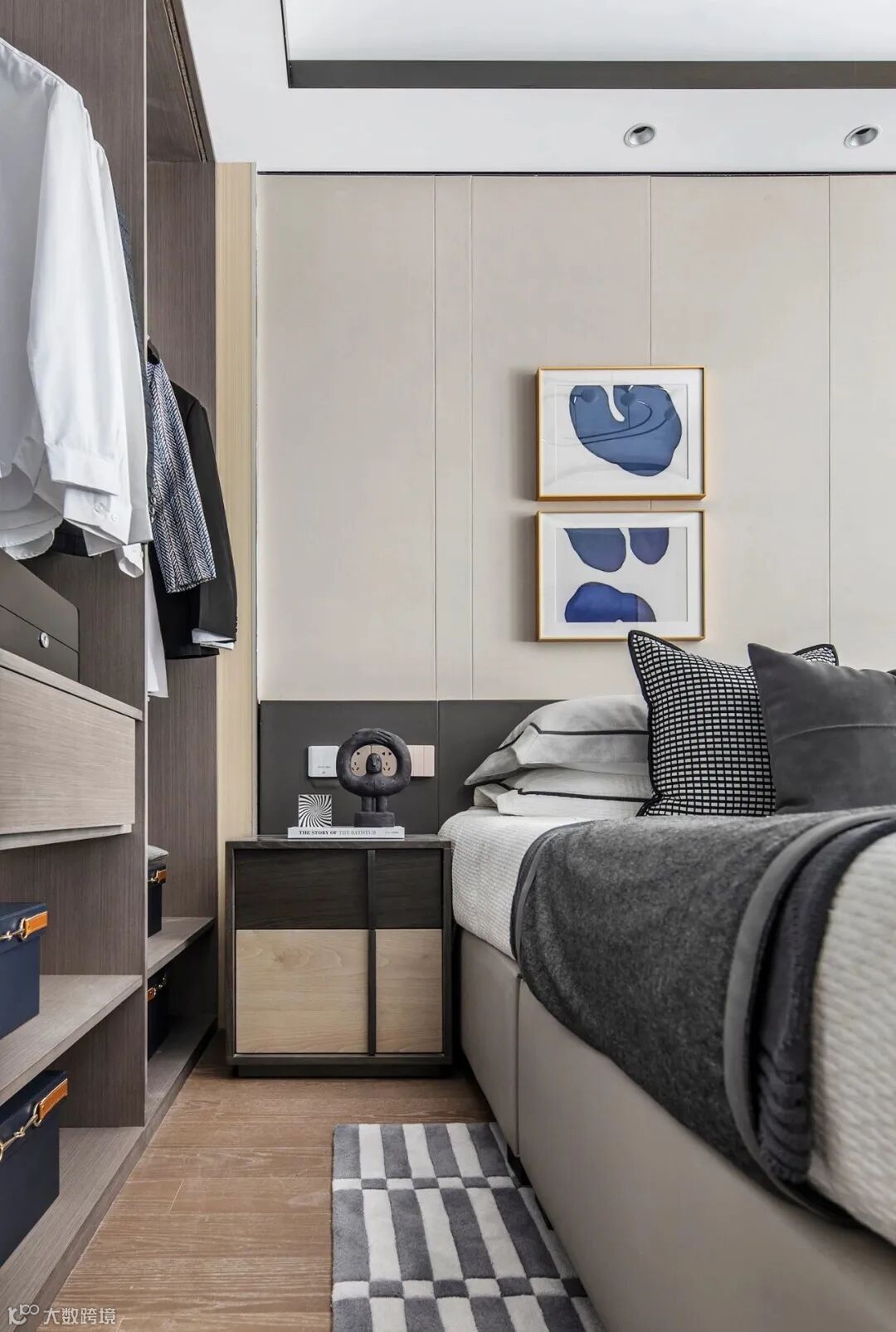 主卧空间以层次丰富的中性色为底,以克莱因蓝为跳色,黑白元素贯穿在空间中。柔软的床品及温和的木色传递出温馨的质感,艺术感的饰品挂画将空间的艺术氛围烘托而出。