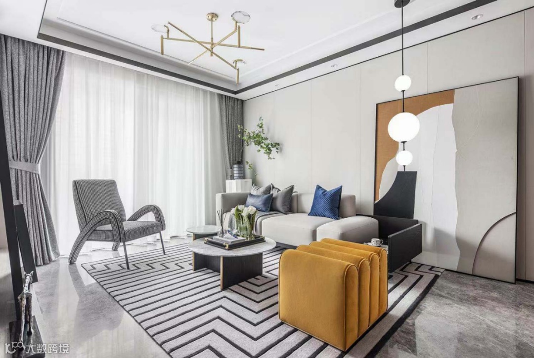 客厅空间于冷静的基调中选用层次感丰富的黄蓝色作为主要跳色,搭配黑白纹理的地毯与单椅,为空间增加了时尚摩登的气息。艺术感的单品突出点亮了空间,绿植的点缀、留白的软饰增强了空间的呼吸感。