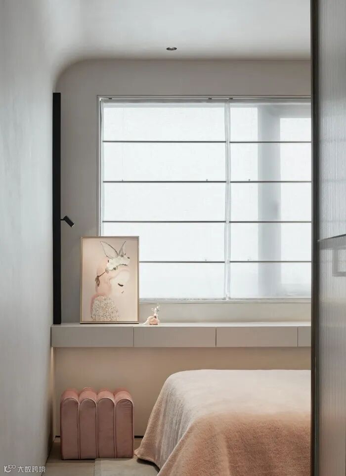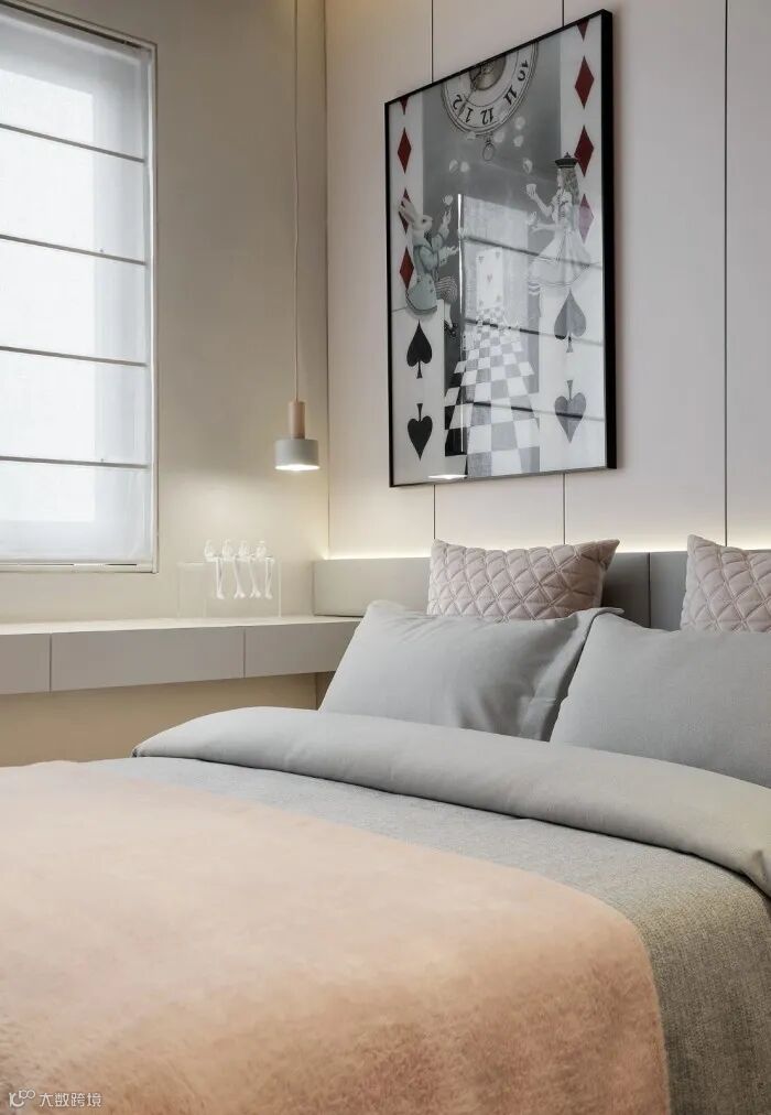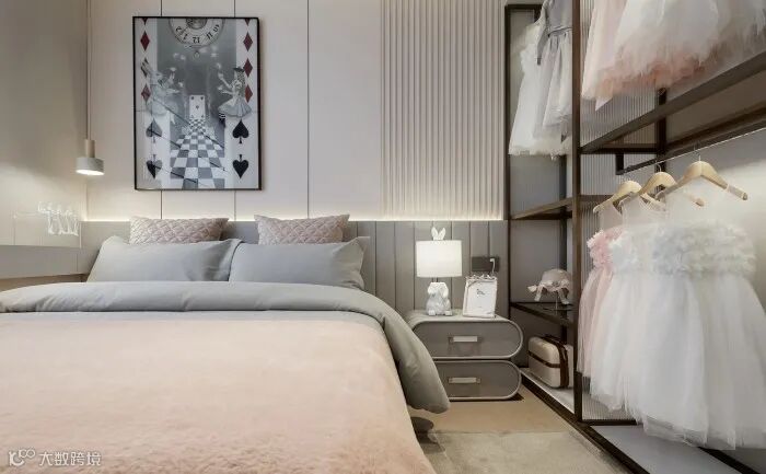 儿童房则用马卡龙的粉色和灰色来打造温馨、梦幻的主题氛围,墙面爱丽丝梦游仙境的主题挂画,让人不由自主的代入到电影的情节中,开放式的玻璃金属衣柜,满足功能的同时又兼具美观。