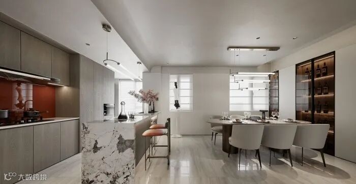 餐厅布局自由中透着秩序,开放式的中西厨把空间尺度扩大延展,潘多拉石材延续客厅与玄关至吧台,昂贵的奢石与低饱和的暗红相互映衬,贵族气息铺面迎来。
