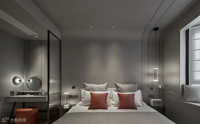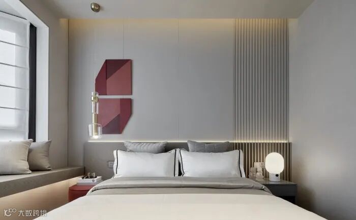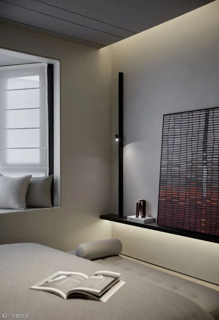 主卧的麻布硬包背景延续至天花,质朴的质感包裹整个睡眠空间,精致的金属收口又透出极为严谨的奢华,奢华与自然形成对话,凸显自信与清雅的贵族气质。