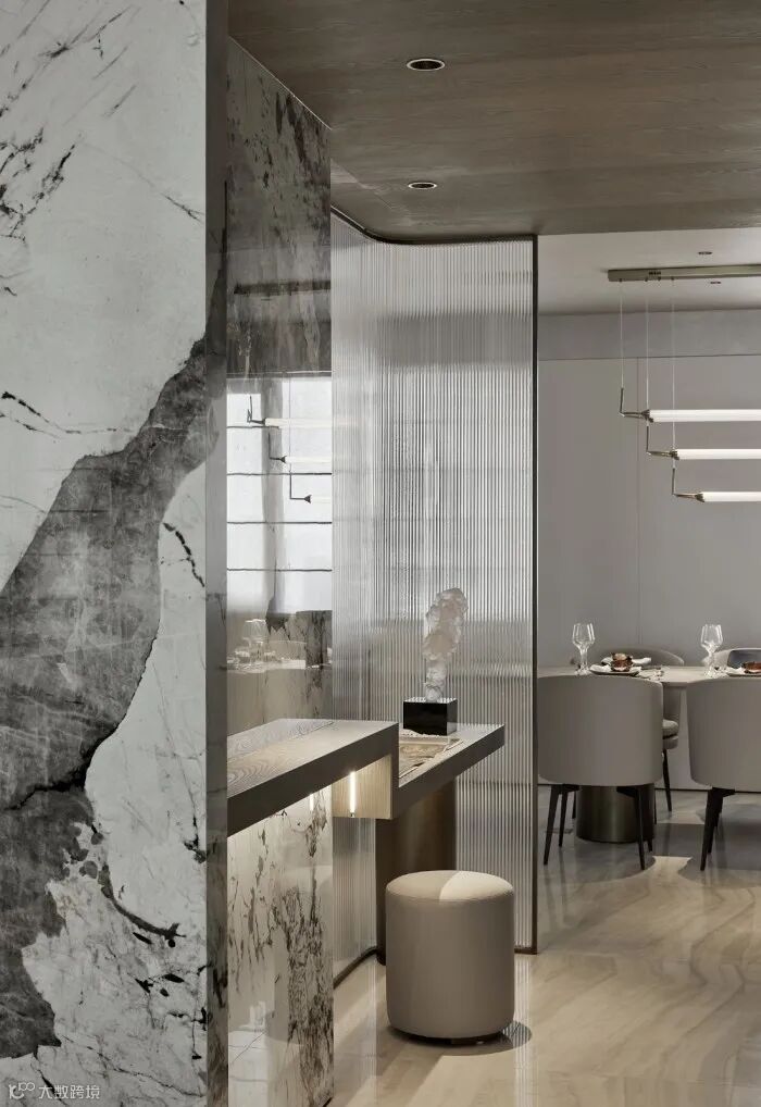 玄关的石材岩板贯穿整个空间,大自然的机理与雕琢精美的玛瑙狮子在灯光的映衬下,让诗意与灵动扑面而来,直击心灵!