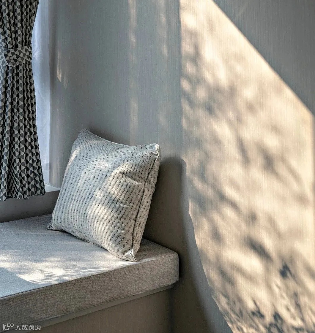 飘窗空间改造为舒适榻榻米区域,灰色布艺肌理自然淡雅,提供放松或冥想的空间维度,光影错落间,给空间带来多重变化和惊喜。