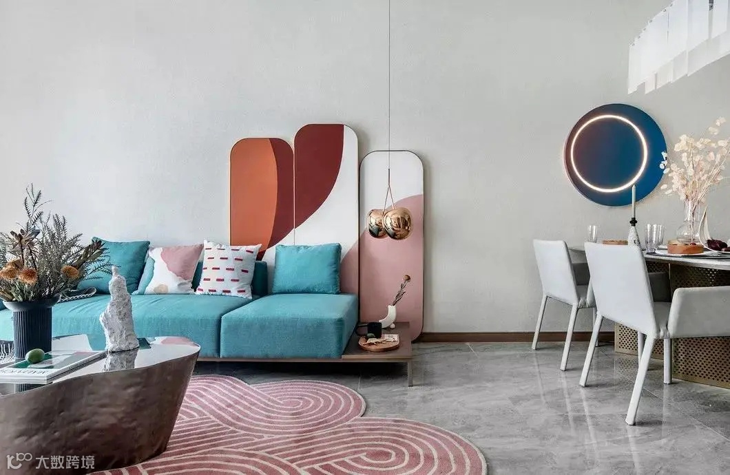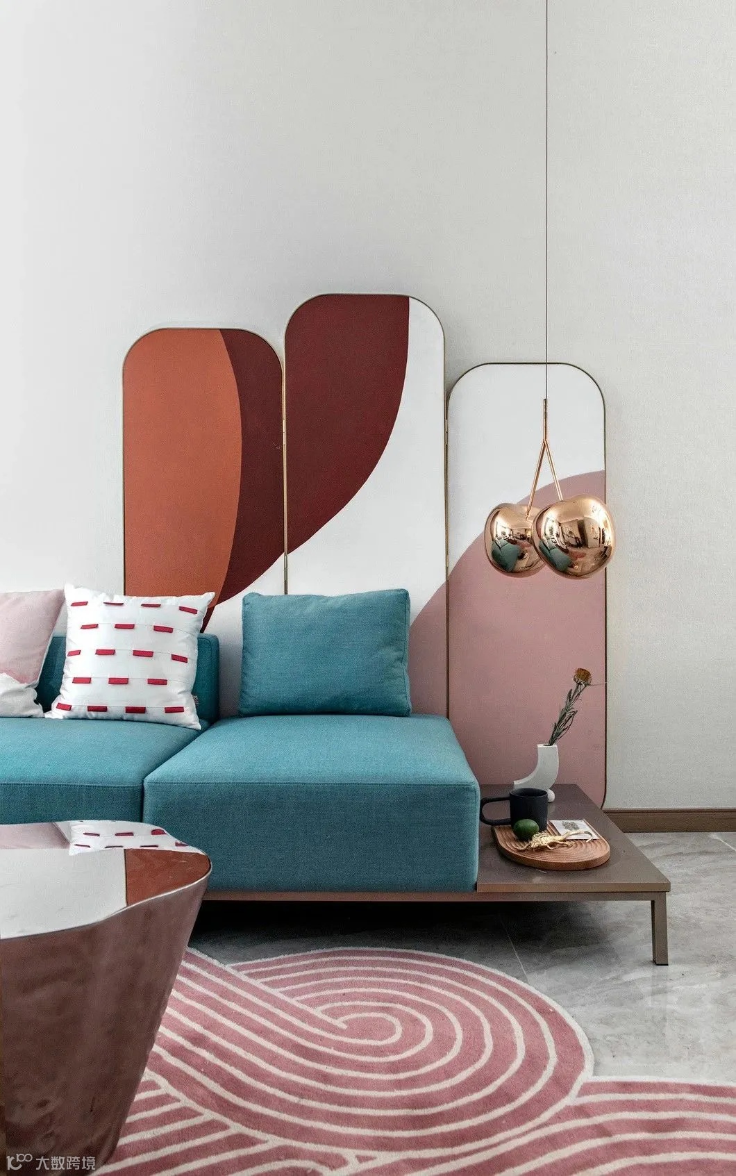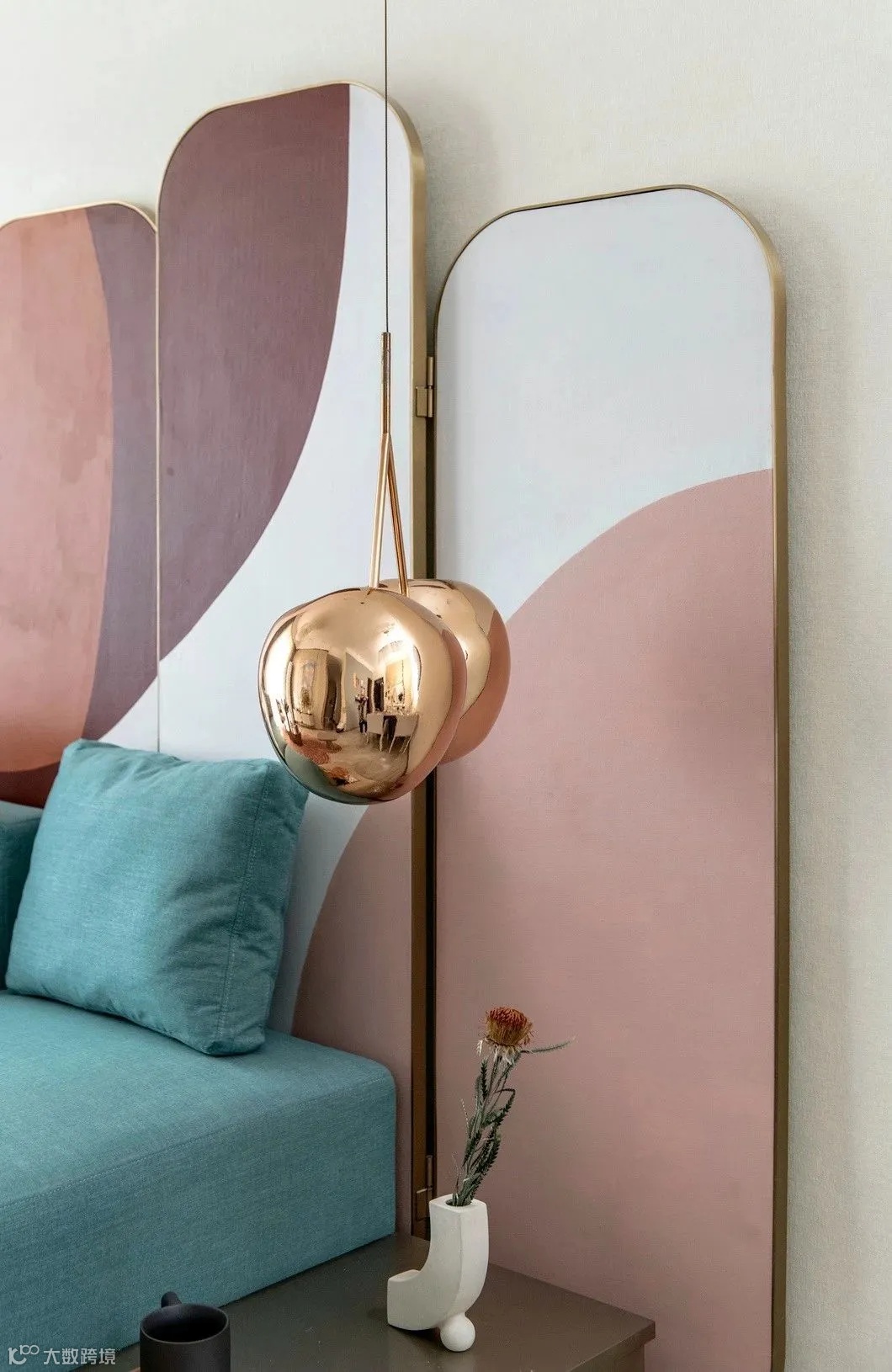 客厅沙发区域运用千禧粉与天蓝色调的碰撞,与黄铜吊饰共同发酵时光,演绎出时髦而梦幻的多元层次。