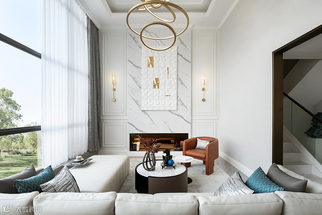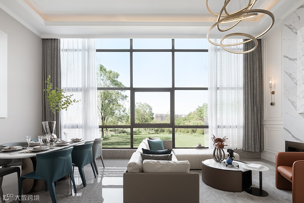 客厅是家庭活动的中心,拥有较多的采光与通风。整体采用白色线条和木饰面,营造优雅舒适的高级氛围。设计中运用了法式抽象思维,通过古典与现代的完美结合,打造时尚精致、层次丰富的室内空间。