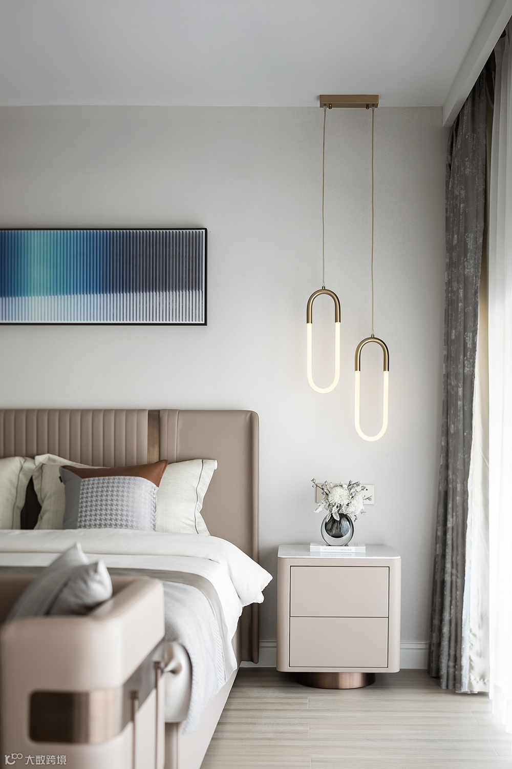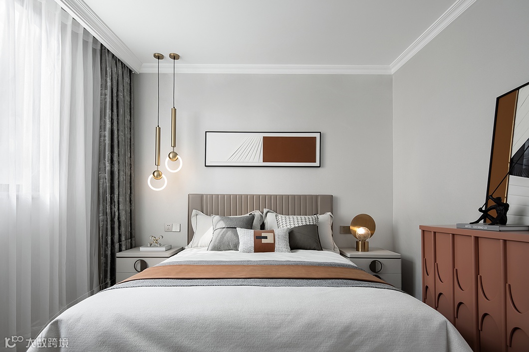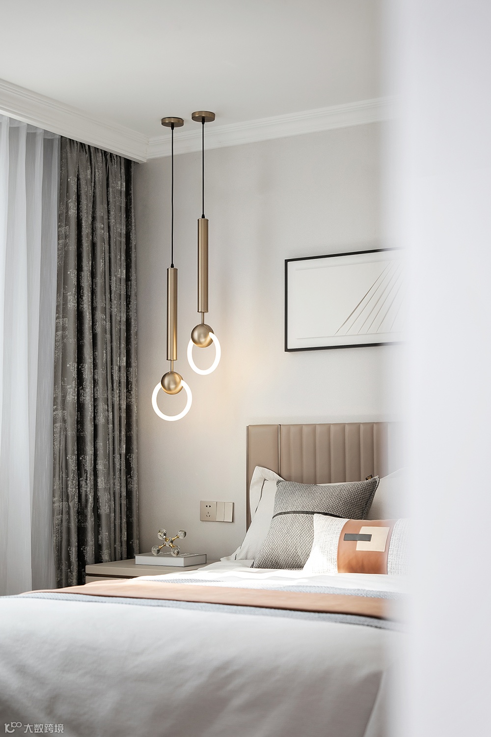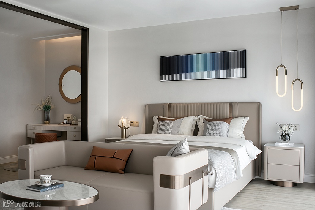 主卧静谧有序,光影在彼此间形成隐隐的虚实关系,简约家居和灯具构造出静默安然的视觉效果,床尾不可或缺的独立沙发和茶几,提升居室的另一种休闲感。