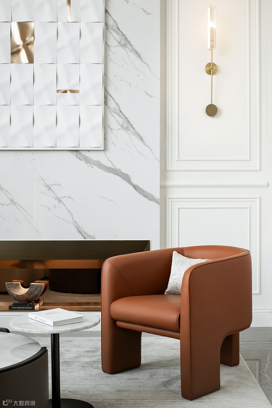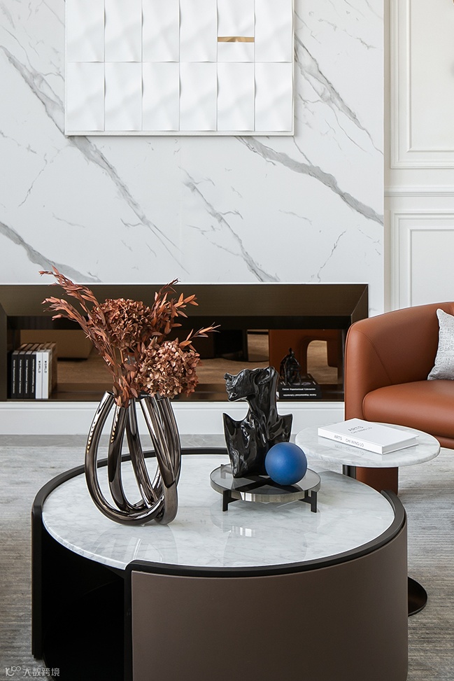 休闲椅的暗橙色绽开了空间的时尚感,搭配浅灰色地毯、层叠圆形茶几,用色彩点缀出韵味,使空间更具层次感。