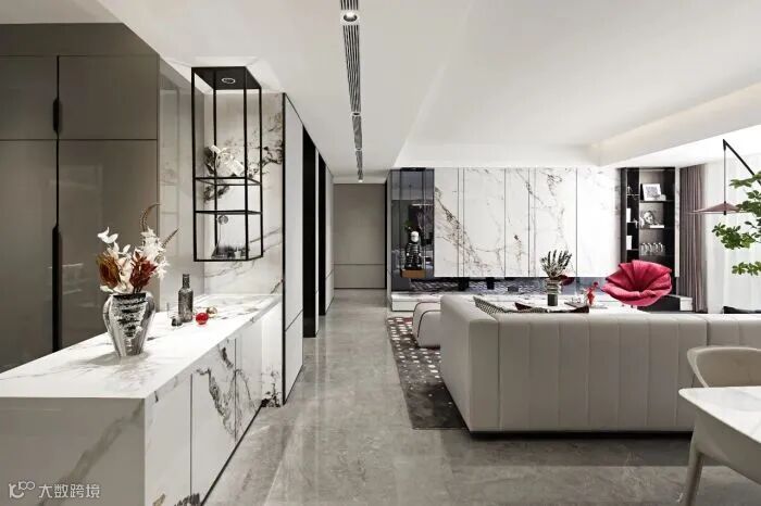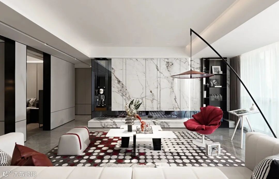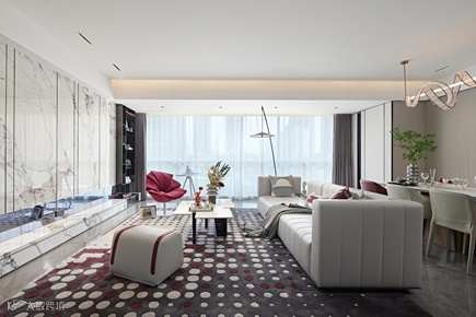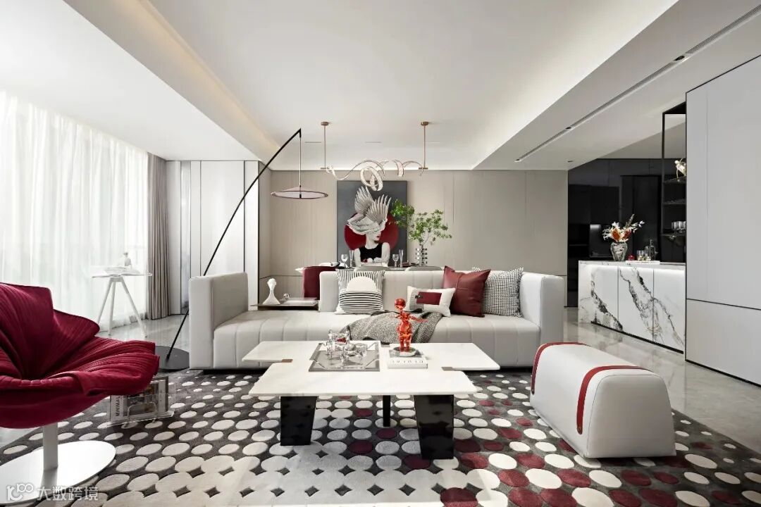 进入到开放式客厅,如同漫步于都汇的十字路口,丰富多彩而又井然有序,合理的空间布局,充足的采光,带来不一样的视觉体验。金属,皮革大理石等材料的运用,渲染出与时代相称的艺术气息,点点红色彰显艺术的魅力。
