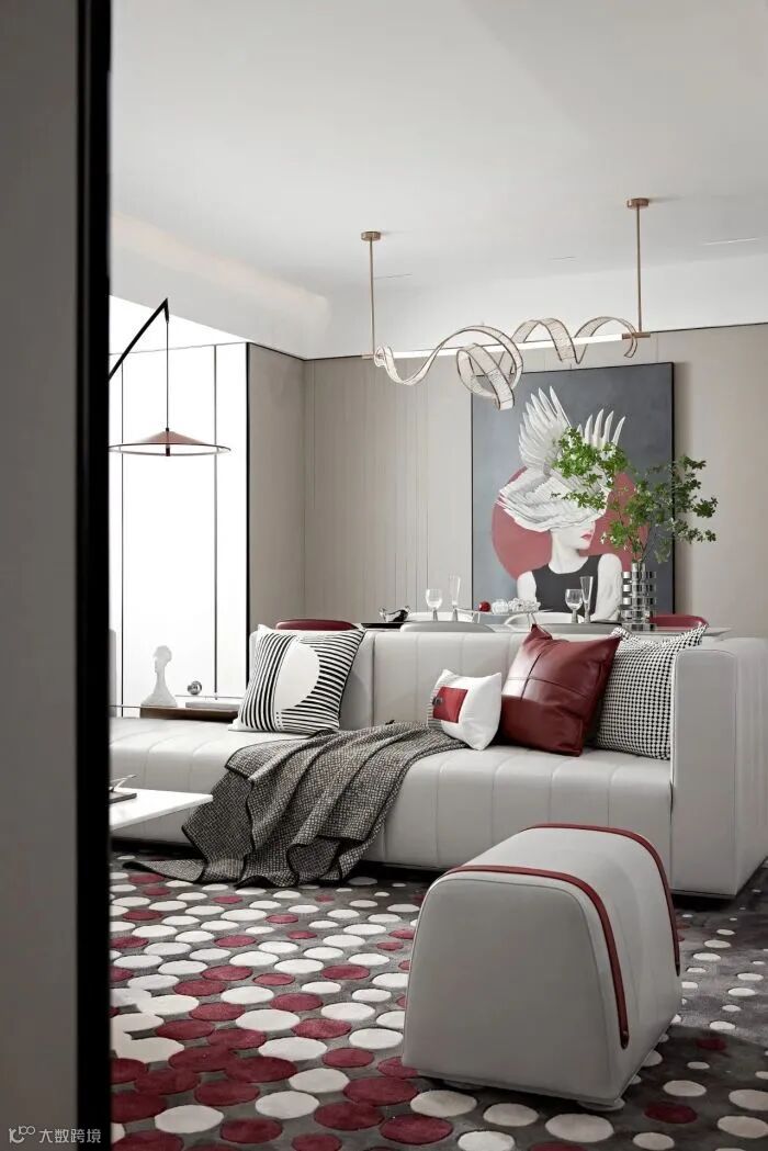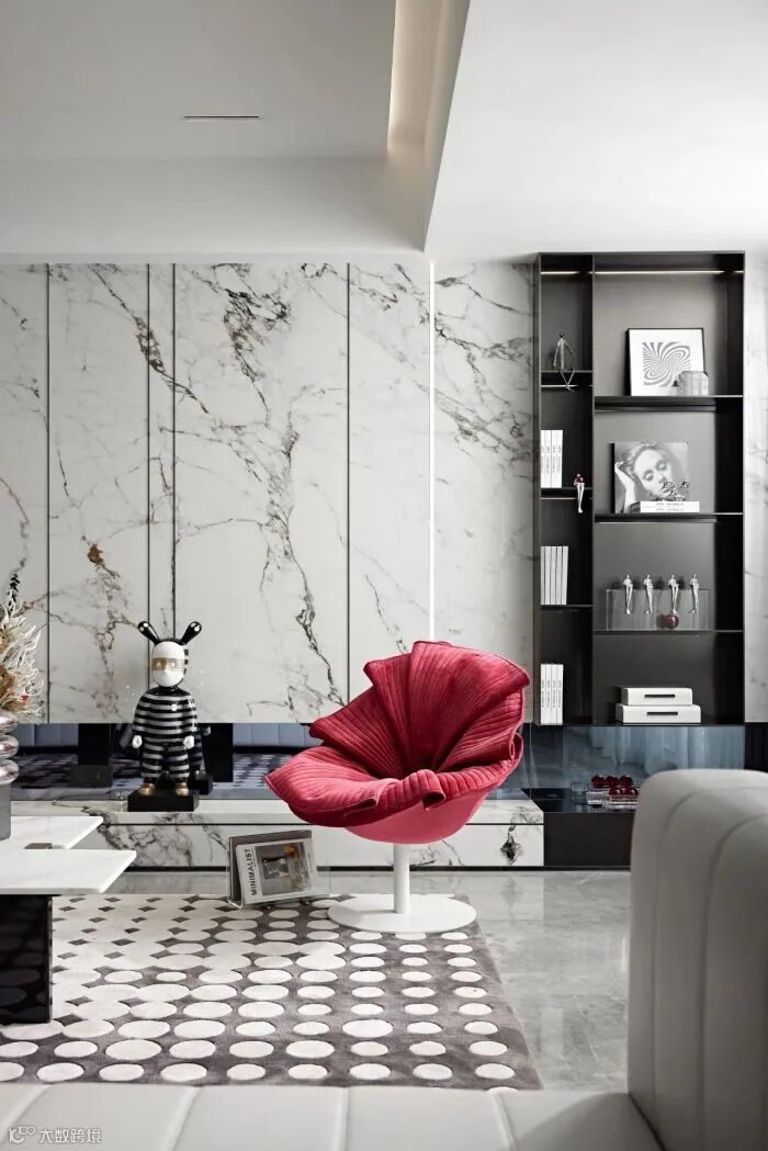 地面处的圆点地毯融入现代时尚元素,带来更立体生动的视觉体验,大理石茶几底座极简而富有张力,台面与墙面相呼应。