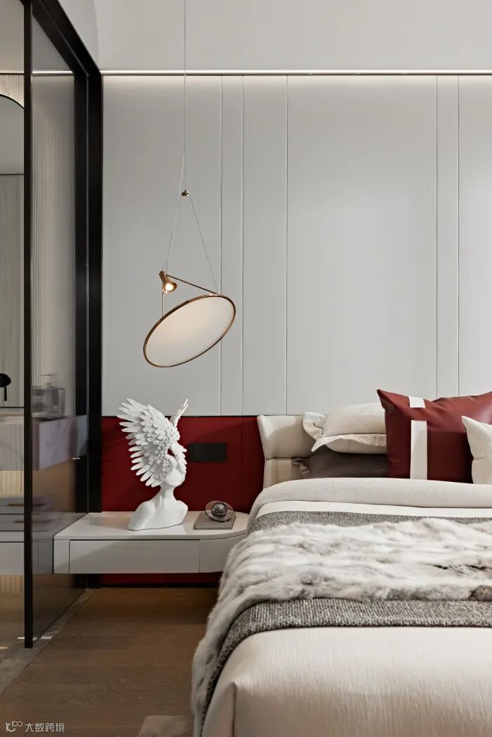 主卧延续动区的设计思路,米白色的背景跳脱红色,加入半透的玻璃隔断、艺术摆件等细节处理,描绘出时尚优雅的都市生活蓝图。
