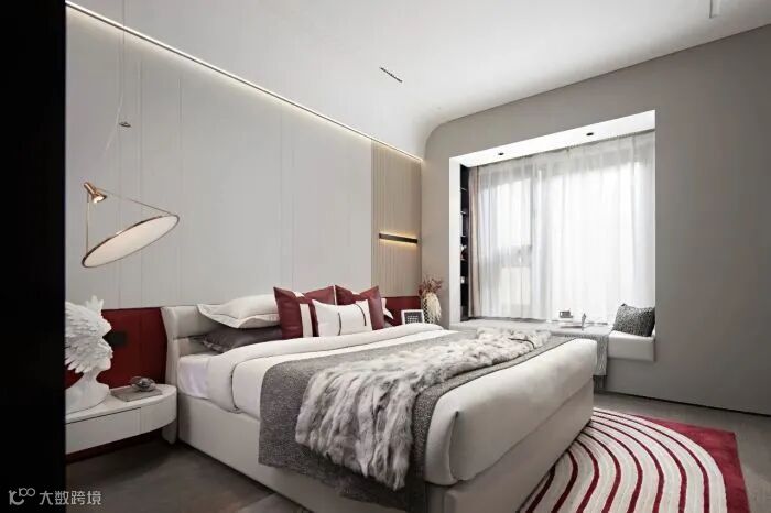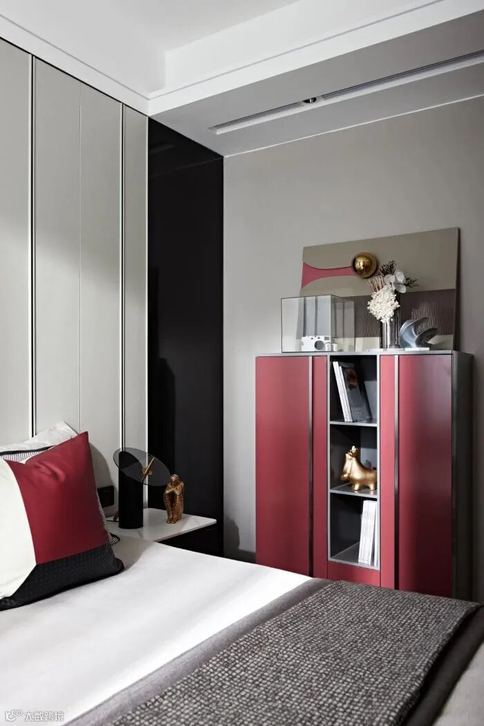 客卧高级灰色与绛红搭配恰到好处,灰色本身的优雅气质与天然材质面料等搭配,简洁而不随便,高级而不浮夸,缓缓躺下到舒适的梦乡,感受治愈的气息。