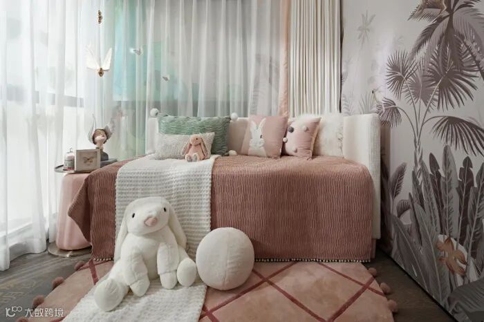 儿童房蝴蝶造型的艺术吊灯,创意十足的手工蝴蝶画、可爱的摆件,每一处都散发着梦幻气息。
