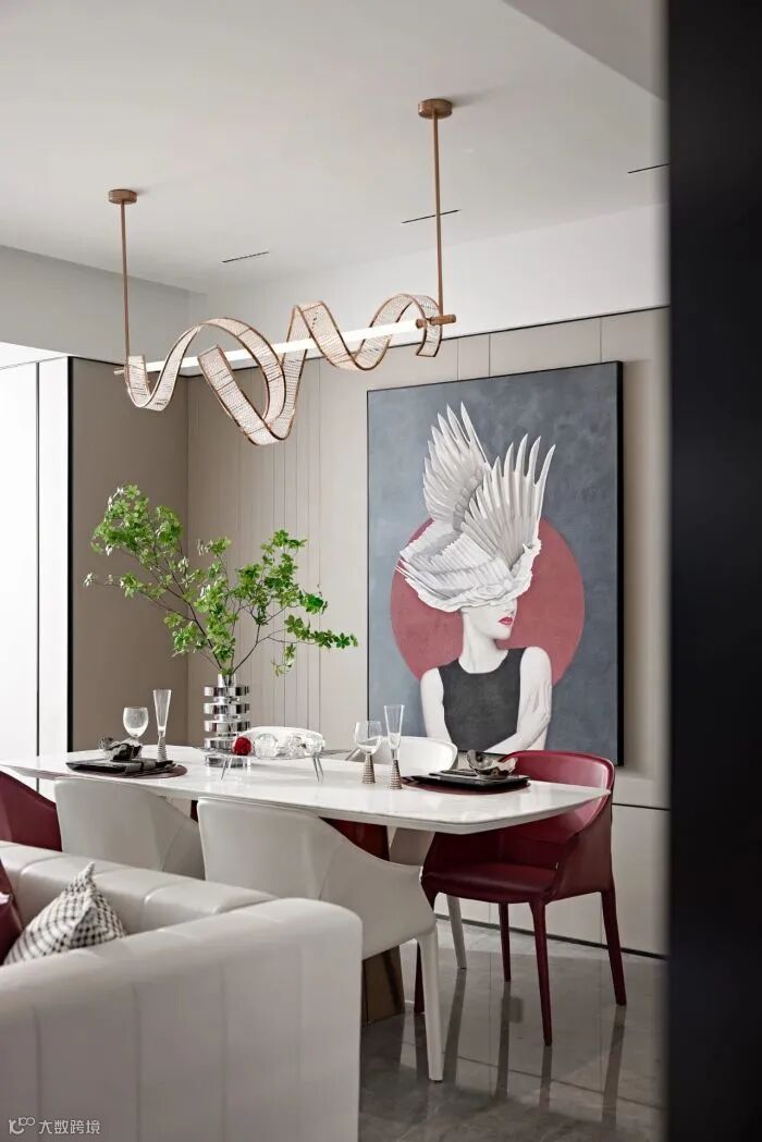 极具艺术形态的金属吊灯结合晶莹的水晶,在光线下映透出生动精致的空间光晕,兼具秩序感与灵动性。作为点睛的当代术画作,使得空间艺术氛围油然而生。