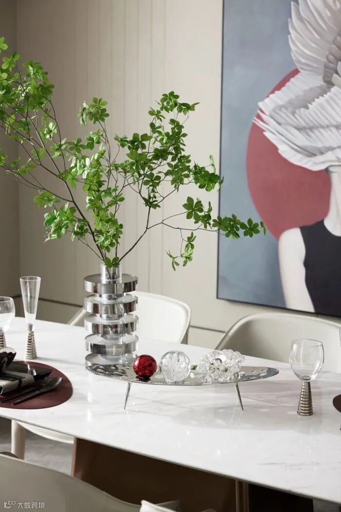 餐厅延续客厅饱满鲜明的色调,搭配吊灯与艺术摆件的点缀,打造出精致、奢华的空间质感。