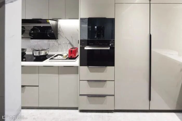 开放式厨房让空间的利用率达到极致。大理石、镜面与金属等不同材质的互相碰撞,充分展现美学的视觉冲击。