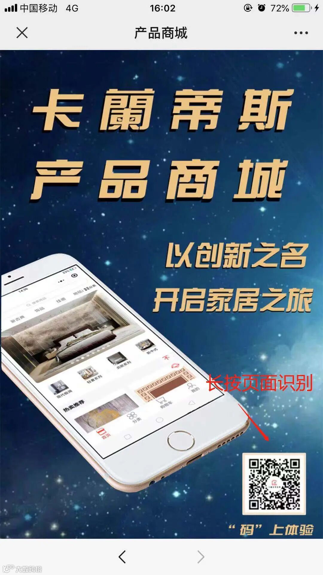 点击【产品商城】,长按页面识别二维码进入卡兰蒂斯产品商城,即可在产品商城上进行家装商品选购。