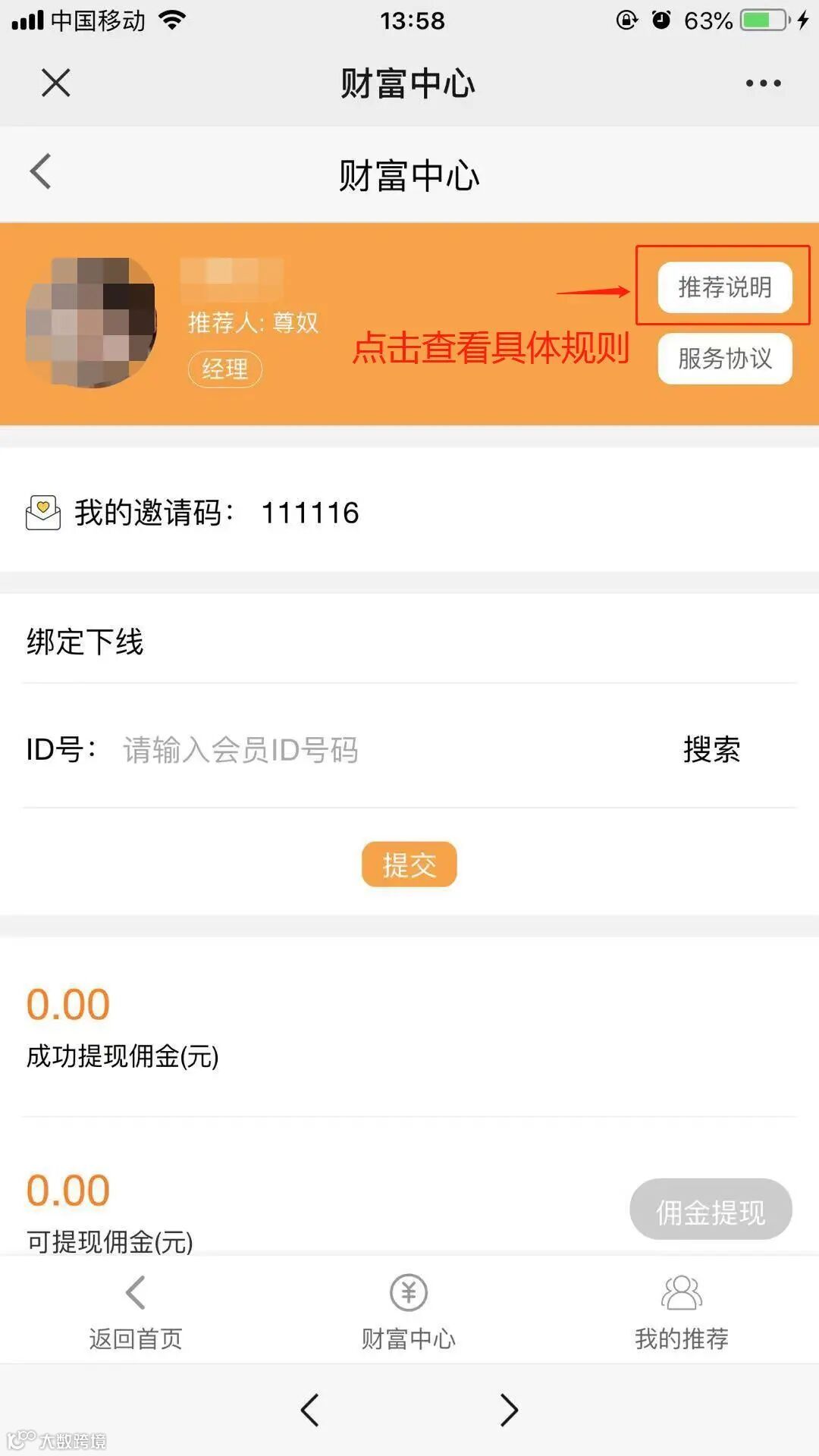 审核通过后可到达【财富中心】,分销商(即推销经理)可在此页面阅读并熟悉推荐规则,包括推荐方式、推荐佣金、责任等细则。