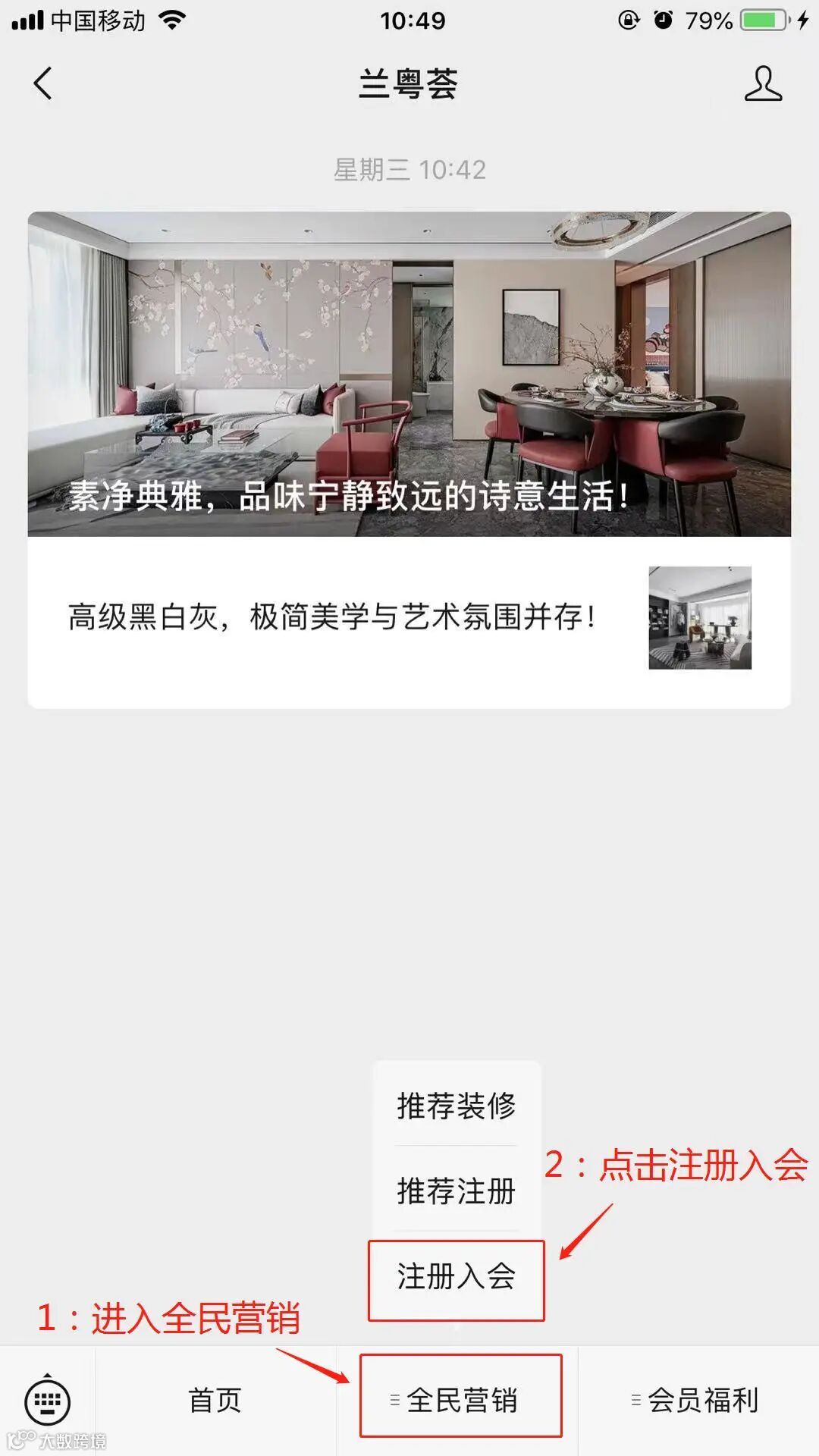 点击公众号菜单栏【全民营销】,点击注册入会成为兰粤荟会员。(须注册成为“兰粤荟”会员后方可进行推荐装修。)