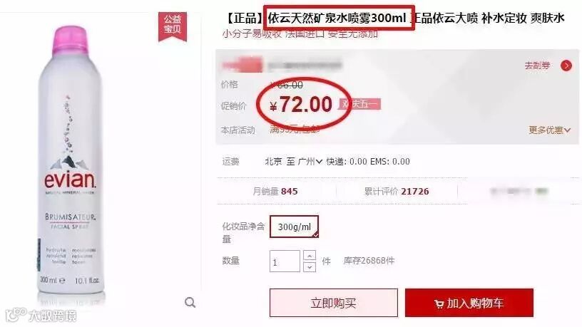 某猫商城,依云矿泉水喷雾居然要72元