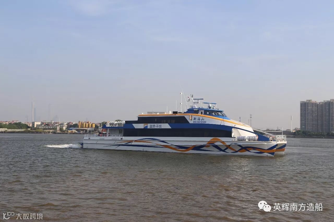 10月30日16:36,“新海山”轮经过一天的海上航行试验返回码头。该船是英辉南方为珠海九洲控股集团承建的的第五艘铝合金双体高速客船,设计航速为36.5节,实际航速达38.96节。