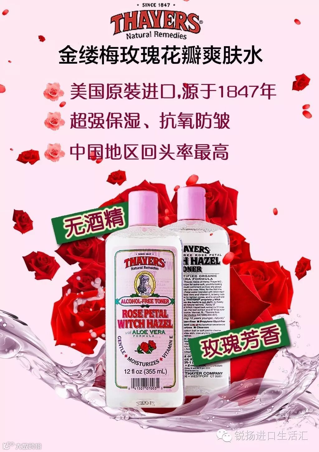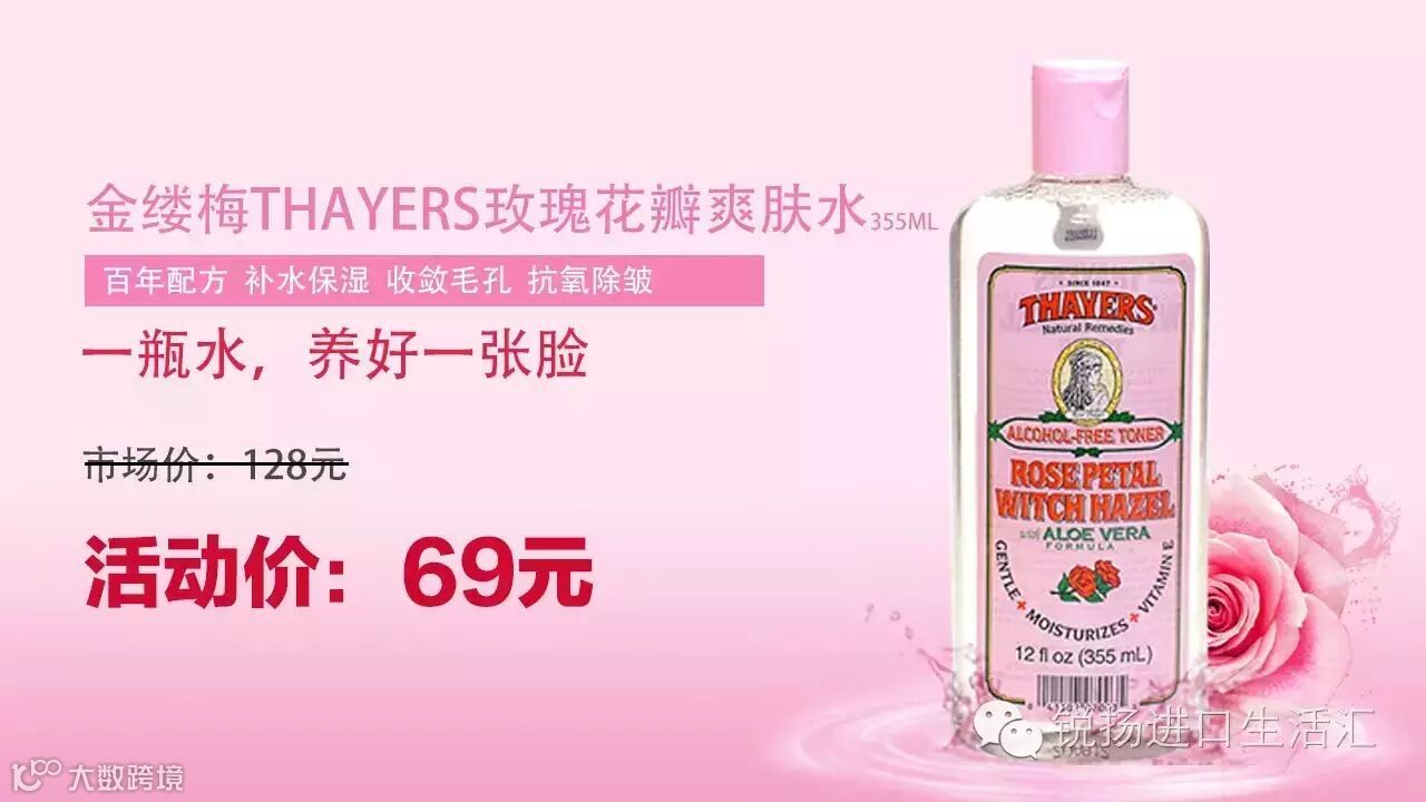 金缕梅玫瑰花瓣爽肤水这款水是由Thayer小姐从玫瑰花瓣中萃取的秘方,与金缕梅精华混合,添加天然芦荟和维他命E等卓尔有效的保湿成分,百分百无酒精配方,温和得连敏感皮肤都可以使用。