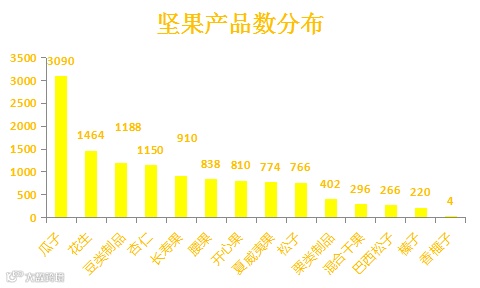 互联网坚果售卖种类繁多,我们常见的花生、瓜子、豆类制品(如炒豌豆)占据坚果单品种产品数前三甲,本土的坚果以其低廉的价格、多变的口味在坚果市场中风生水起;同时,杏仁,长寿果等相对价格更高、产地较少的品质坚果也渐渐走入互联网市场,争取在坚果市场占得一席之地;另外,本土坚果中的栗子售卖数量并未在前列,虽然栗类产品积极开发新技术,摆脱新鲜坚果产品的时间限制,让新鲜食用的坚果四季售卖,但栗类制品口味单一,导致栗类制品种类少,售卖数量少。