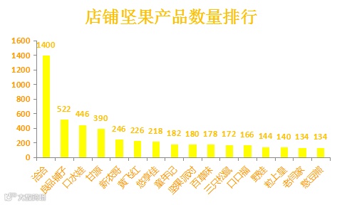 根据数据,品牌“洽洽”以绝对的优势占据店铺坚果产品数量排行榜榜首,观察数据发现,“洽洽”品牌不仅涵盖“瓜子”“豌豆”“开心果”“腰果”等众多坚果种类,而且每种坚果口味繁多,可满足不同顾客的不同需求。“良品铺子”“口水娃”“甘源”分列2、3、4位,三者差距不大。产品种类多,味道全,是店铺线上产品众多的主要原因。