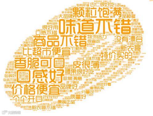 从词云图可以看到,消费者在评价坚果时,主要看重味道、口感、价格。从另一方面说,消费者在通过互联网坚果售卖平台选择坚果时看中的也就是味道、口感、价格,即追求“物美价廉”,所以各大互联网坚果售卖商家需在质量、价格上多下功夫,才能吸引消费者购买。