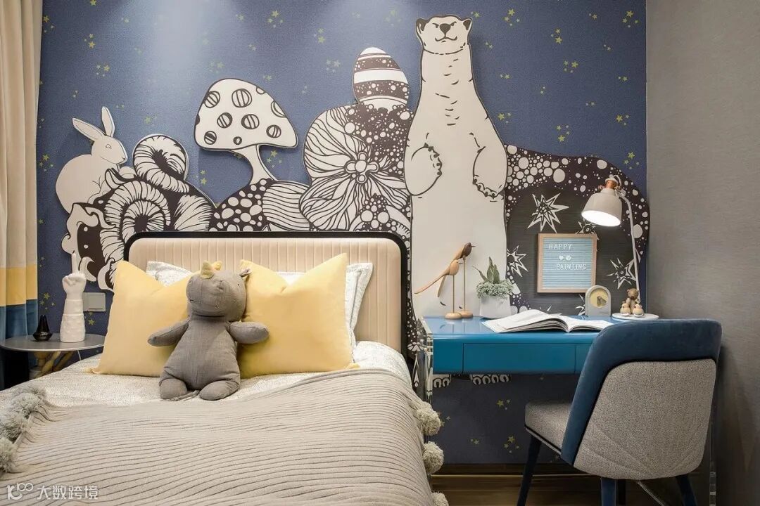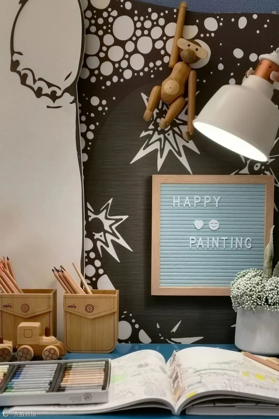用画笔来还原出童话世界,一笔一划都仿佛在诉说孩子们对于美好的想象,墙上的立体装饰画,营造了一种置身漫画书的感觉。