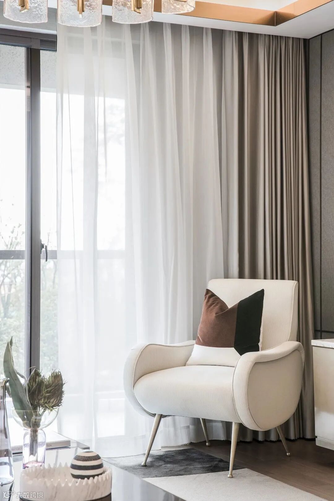 灰白栗色浑然一体,浅咖色窗帘洋溢着贵妇人般优雅的气息,与木质护墙板接连一体,千褶百皱似咖色波纹,一圈圈地荡漾开来。
