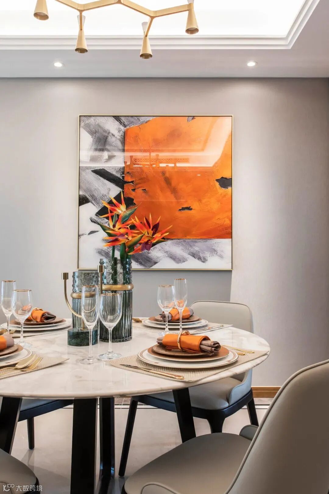 餐厅别具一格让人眼前一亮。放眼望去,恰到好处的橙色精心点缀。大理石的餐桌诉说着质感之美,壁画带着艺术的氛围,整体风格带着浓厚的现代化小资情调。