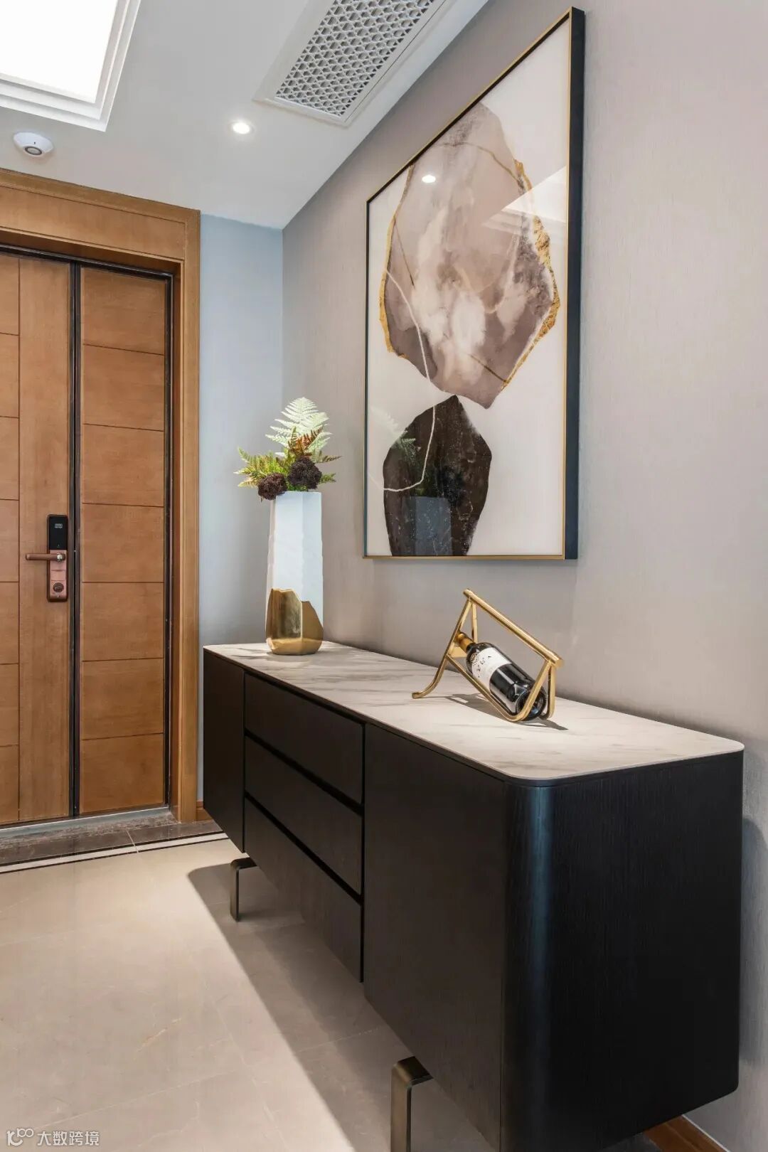 玄关处简约的布置却暗藏心机,一捧花一瓶酒,简单的装饰却无比和谐。墙上大理石背景的画,黑白元素结合,与桌子的黑白设计相呼应。世事不是非黑即白,人情练达即文章,家不止是港湾,更是每一次心灵旅程上的见证者。