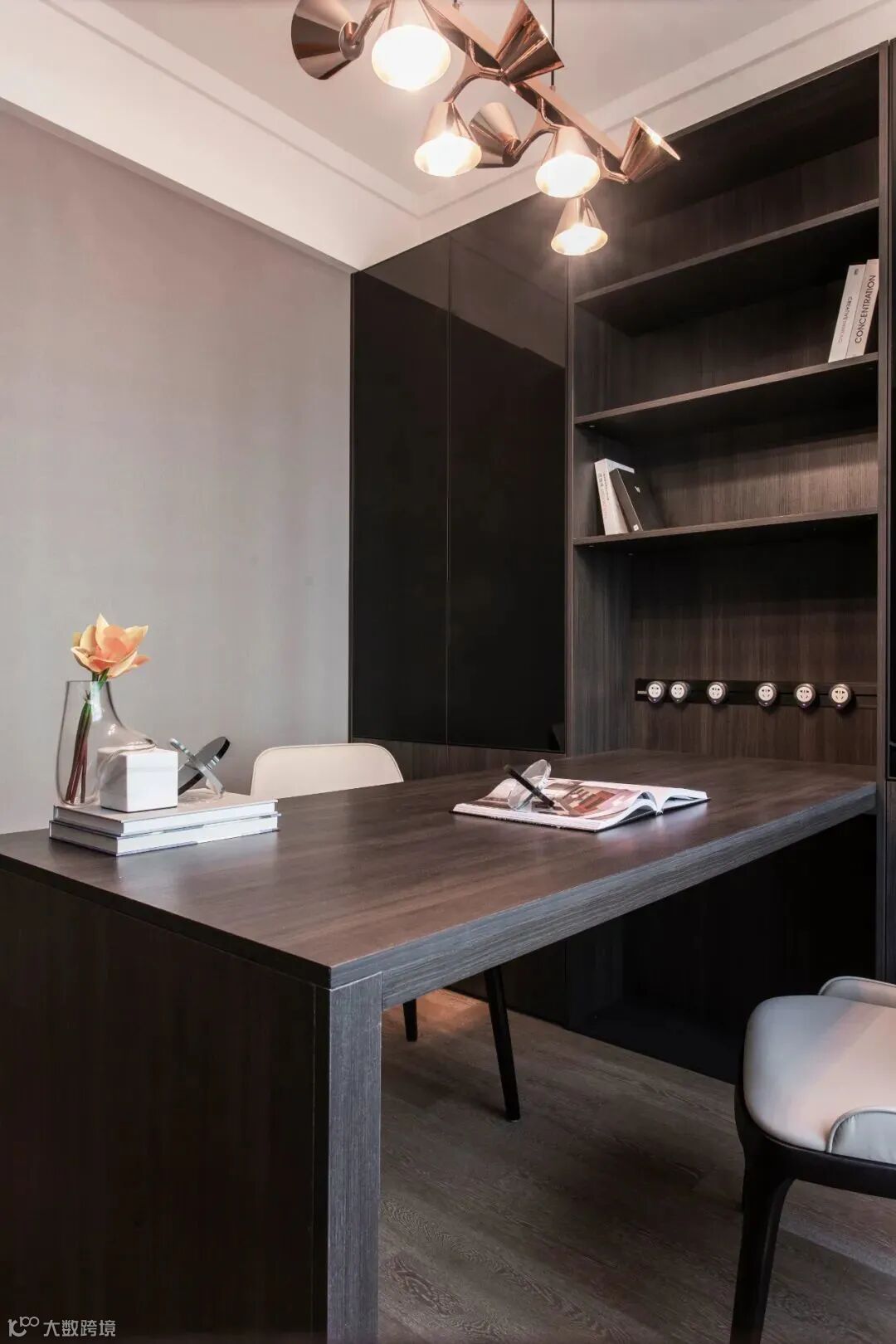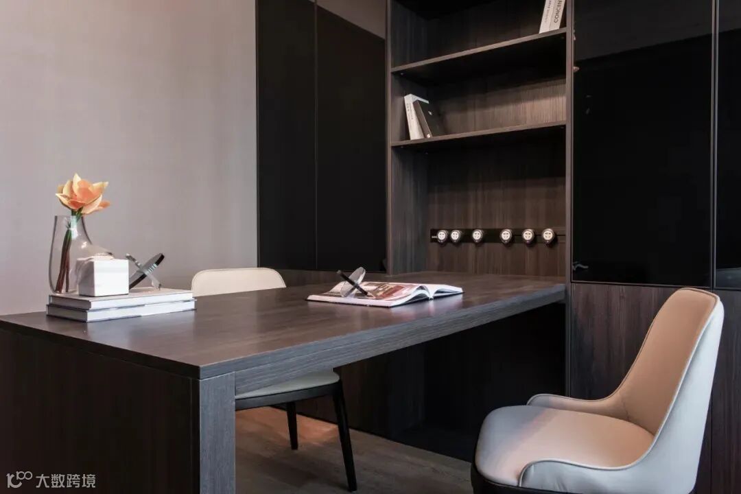书房颇有古色古香之感,黑色调的实木书柜和书桌,有着历史的厚重感,古色古香的意味便随着这份沉稳氤氲在空气中。而吊灯的样式颇具风味,是现代化舞台DJ的模样。
