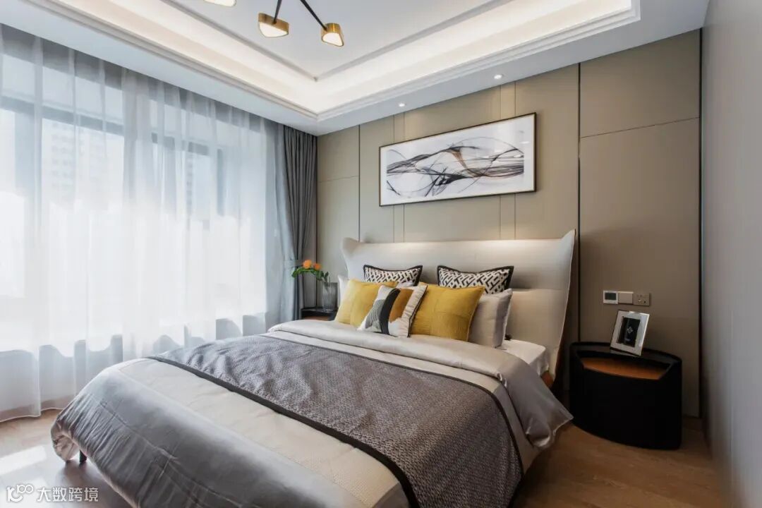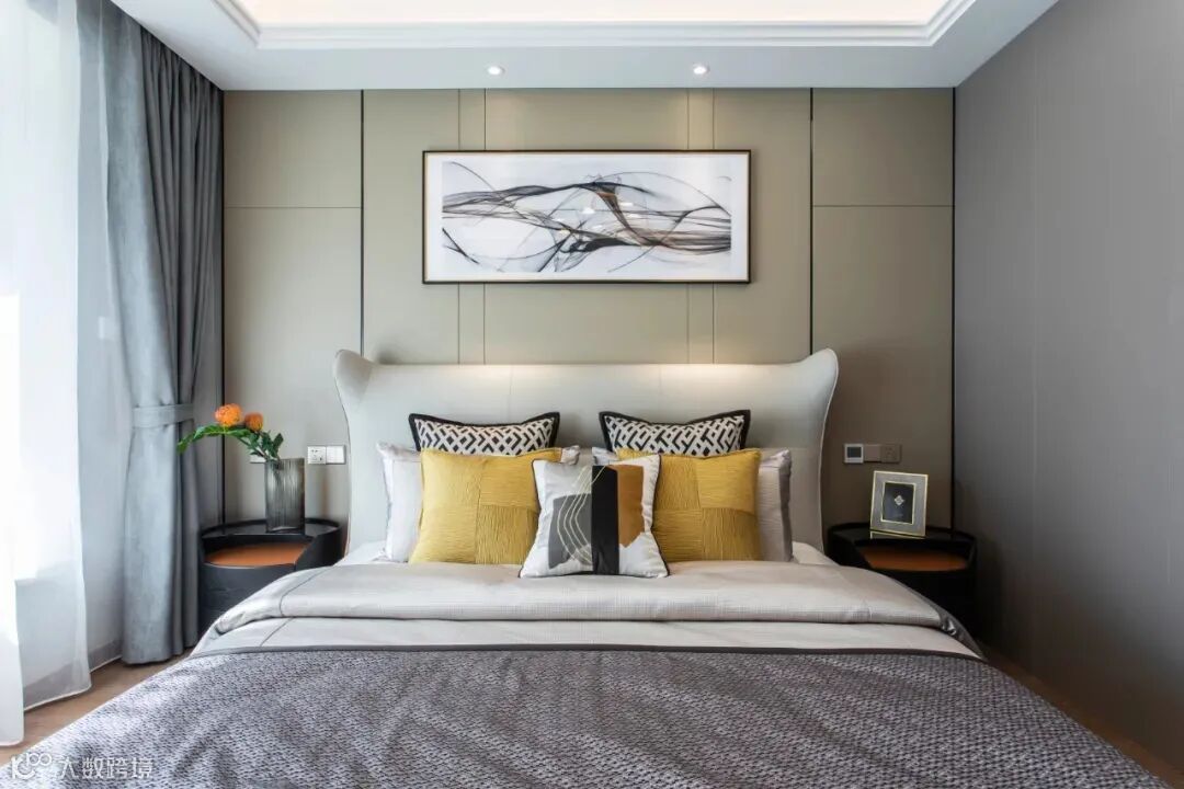 卧室的设计将现代和简约完美融合,淡褐色的床头墙典雅端庄,配上一幅印象派的画,让整个房间散发着艺术气息。