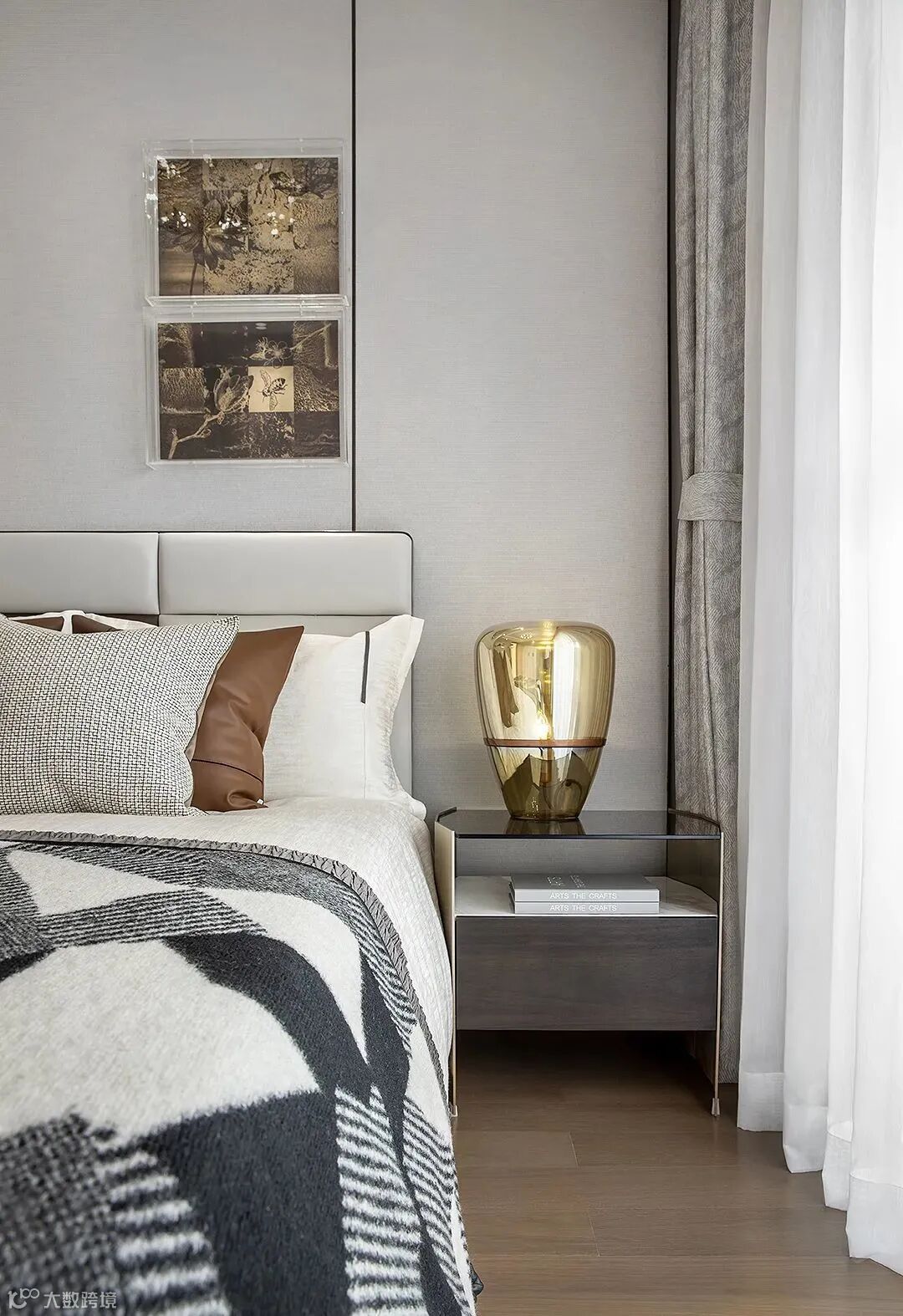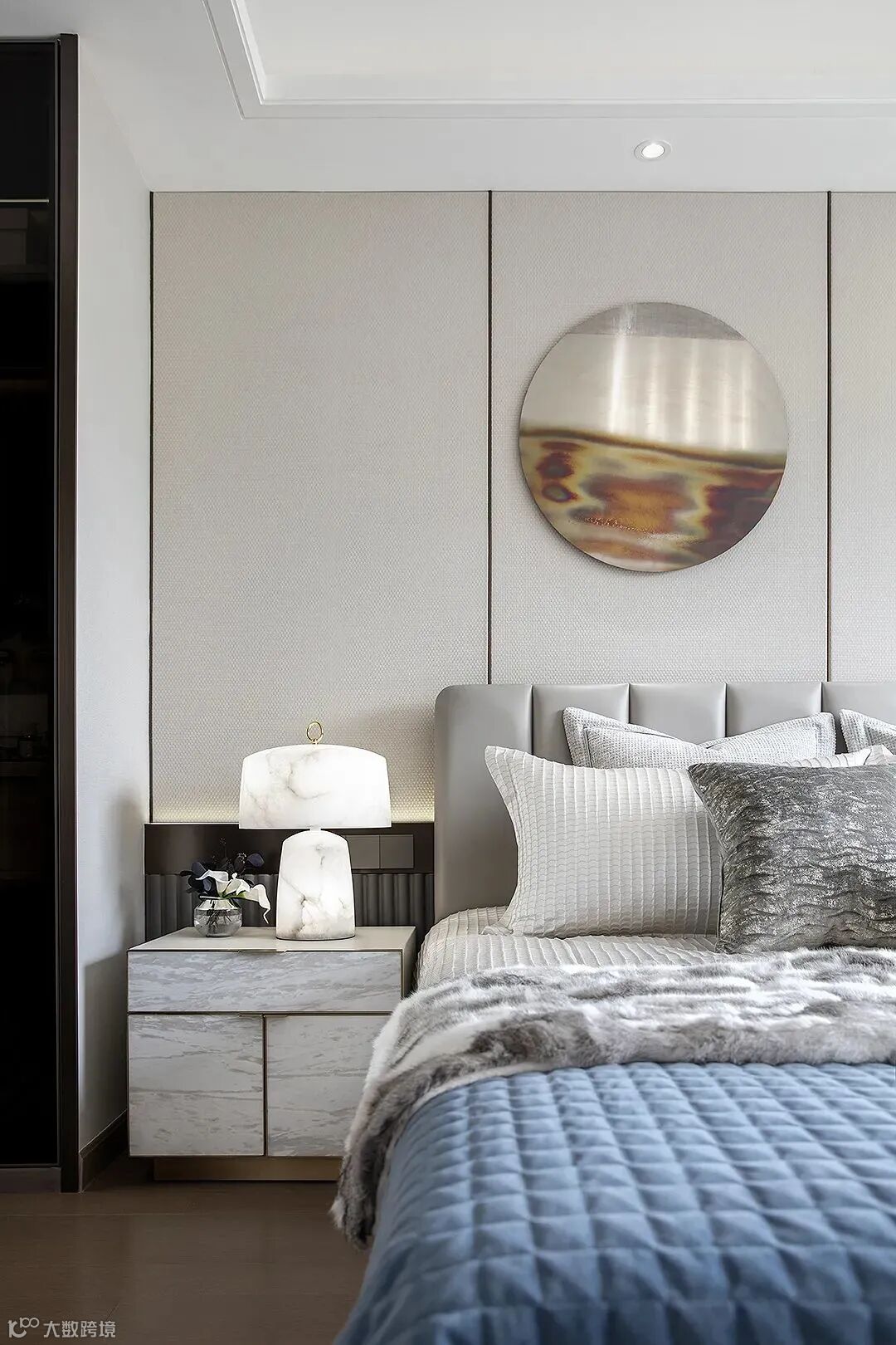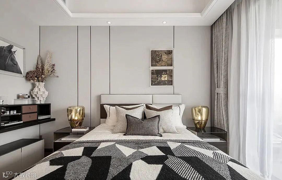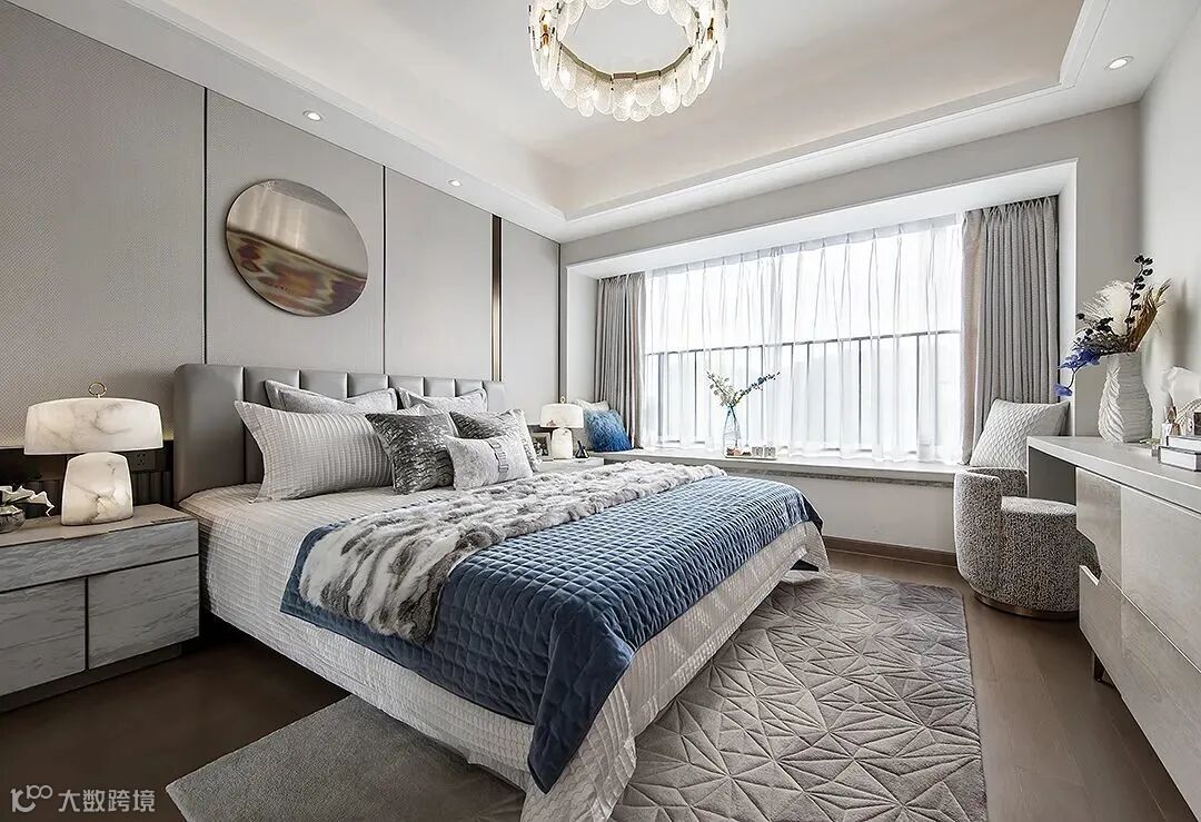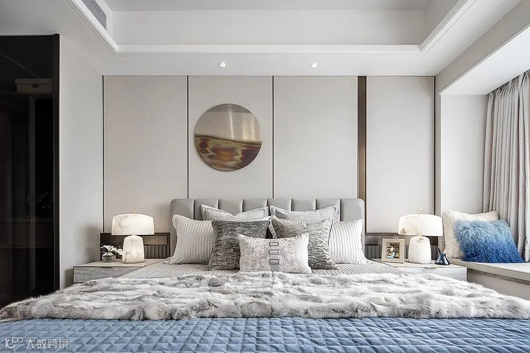 主卧秉承对生活风尚的敏锐触角,设计充分考量了休憩空间的舒适感与品质感,摩登的经典,品味的光泽,整体色调呼应融合,挂饰通过灯光的反射,仿佛皓月当空。