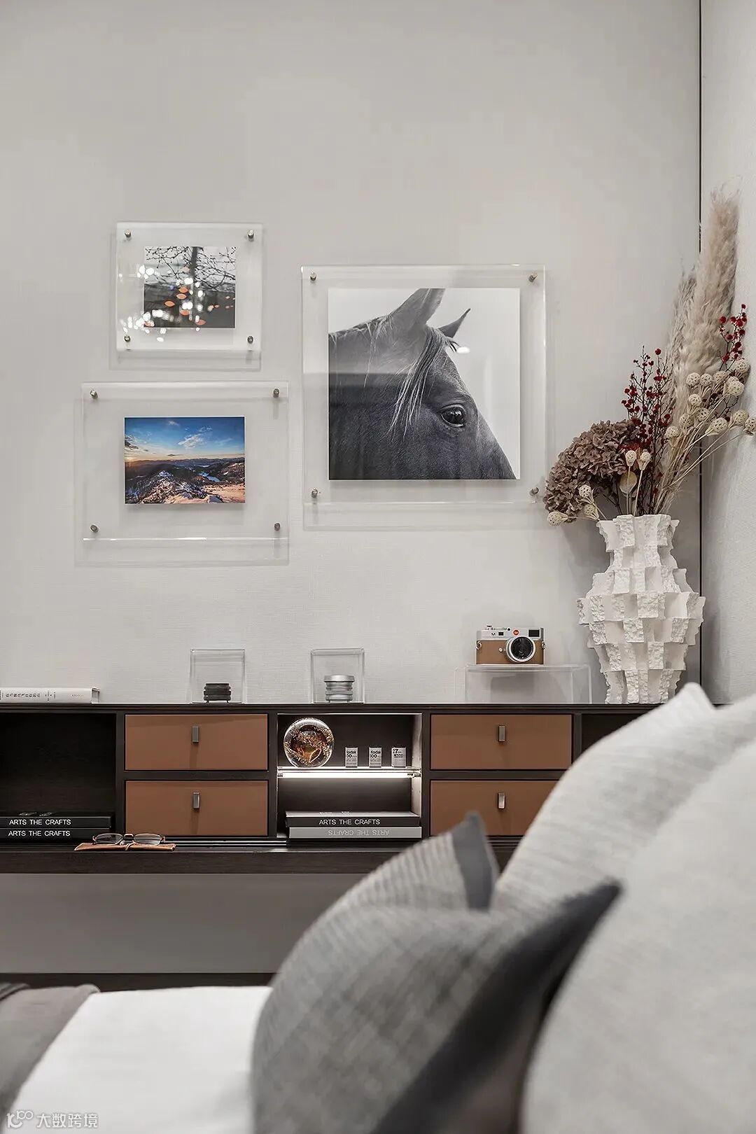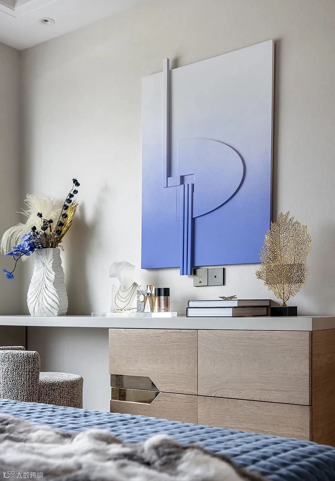 次卧以块面与线条的和谐搭配,以平和的材质色彩,营造出沉谧简宁的整体氛围。