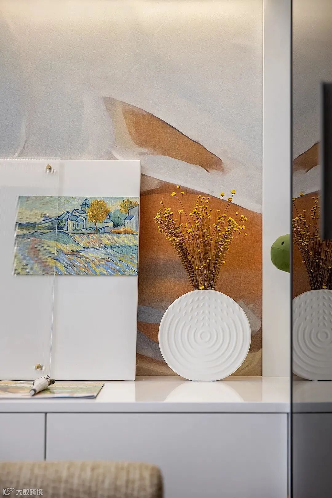 飘窗引入大量自然光,质地柔软的沙发和靠枕添加一丝慵懒的气息,丰盈了空间的质感。轻盈舒逸、极富造型感的花瓶摆件,塑造灵动、隽永的生活领悟。
