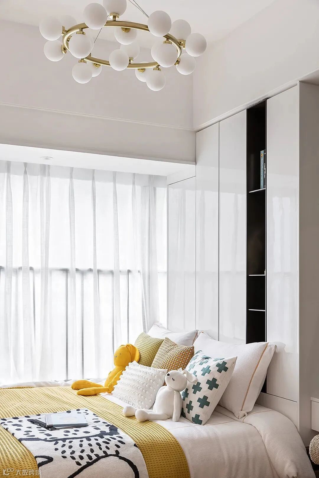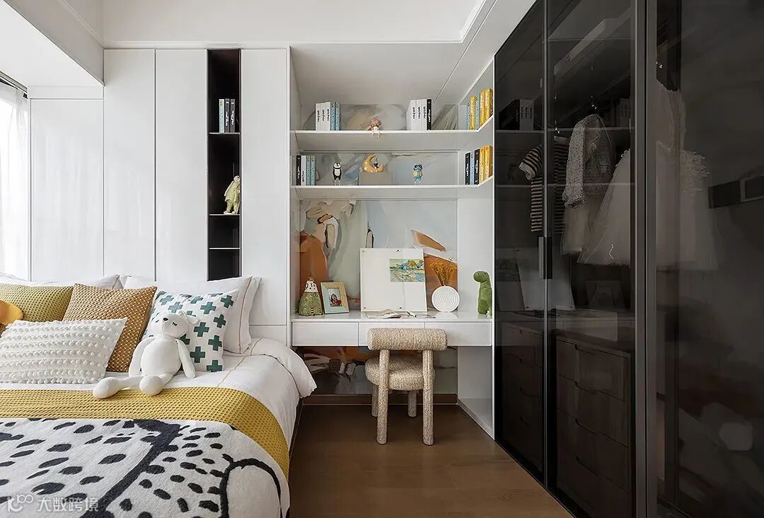 儿童房采用了恬静、清新的基底,纯白家具组合与衣柜的深色相互搭配,利用空间尺度增加了层次感。色调活泼的装饰墙契合天马行空的浪漫想象,为空间抹上一丝俏皮与梦幻,满足儿童纯真可爱的天性。