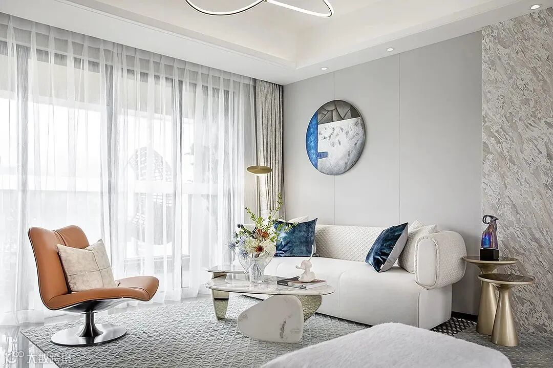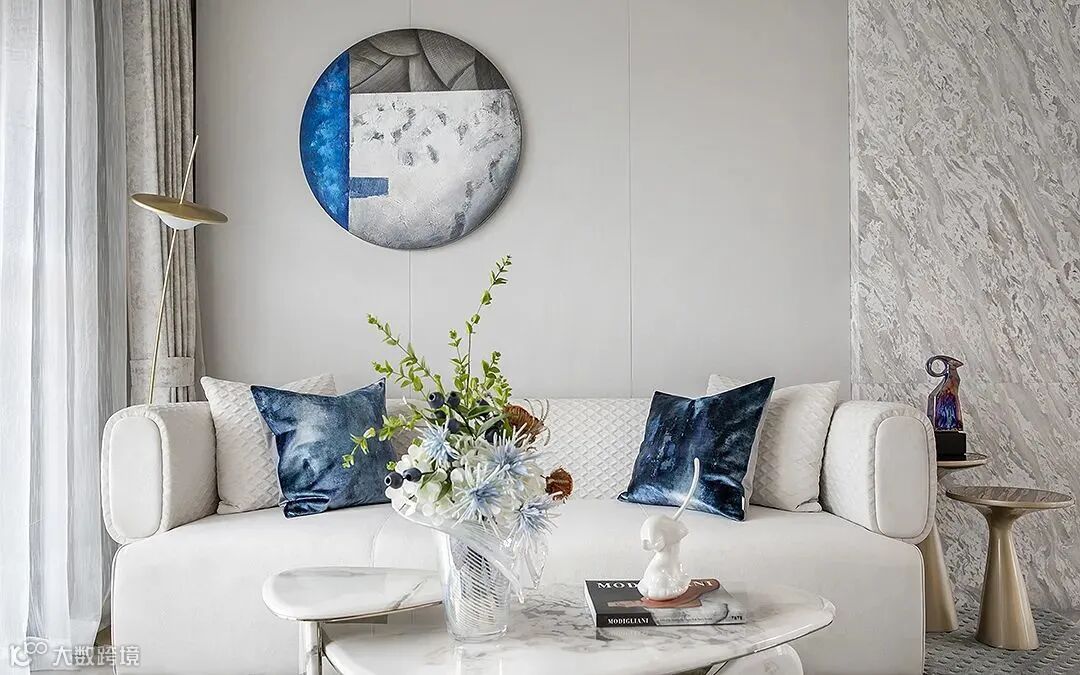 借助家具的曲线与色彩,尽显空间的优雅魅力与生活的时尚趣味。舒适质感的白色沙发与坐凳,不经意间点缀少量金属与艺术品。