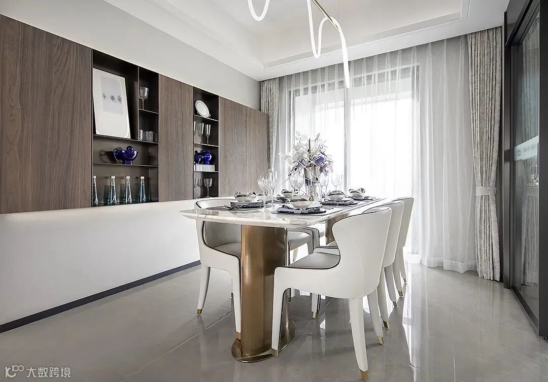 餐厅与客厅围绕家人们的交流与共享,阔达通透的开放式设计,让两者适当分隔,简练平静的线条,清晰明亮的结构,强调了纵深感,带来沉稳而不张扬的美感。