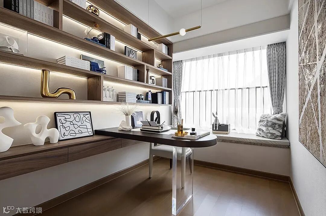 书房的布置是实用性和艺术感的充分结合,简约大气的立面释放更多空间,简单放置书桌(加上书架),面积虽小,但五脏俱全。