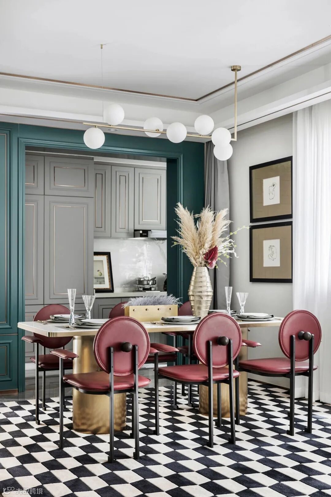 ▍ 餐厅中复古红色的餐椅搭配金色的餐桌