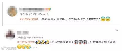 自2015年2月至今,新浪微博“#节后综合症#”的话题主页持续有新帖发布,总阅读量超过1000万。节后第一天尚未到来,已经有网友发帖抱怨“一早起来晕天晕地的”“好想睡他个昏天暗地”。