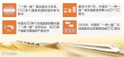“一带一路”倡议提出三年来,100多个国家和国际组织参与其中,中国与30多个沿线国家签署共建“一带一路”合作协议、与20多个国家开展国际产能合作,以亚投行、丝路基金为代表的金融合作不断深化,一批有影响力的标志性项目逐步落地。截至今年7月,中国对“一带一路”相关国家的投资累计达511亿美元。2015年,中国同“一带一路”沿线国家双边贸易额突破万亿美元。从无到有、由点及面,“一带一路”海陆统筹、东西互济、面向全球的开放新格局渐次铺开,建设速度和成果超出预期。