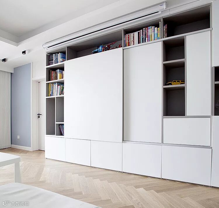 在设计时先预留出“嵌入式”的凹槽空间,或在侧面加建部分墙体,让柜子呈现与周围墙体完全拉平的状态,这样柜子就可以整体隐身。