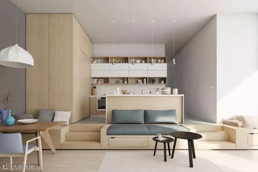 首先,不要浪费任何可以利用的空间,大胆地在客厅、玄关、走廊等角落使用整体柜子,或者干脆用柜子进行隔断,轻松变身收纳高手!