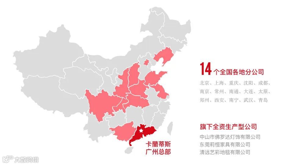 10年间,卡蘭蒂斯已为万千客户提供了优质高效的家具和服务,逐步形成多元化综合型的全球品牌战略集团,在北京、上海、四川、陕西、江苏、辽宁、山西、河南、河北、广西等直辖市及省会城市均有分公司,为消费者的幸福家居生活保驾护航。