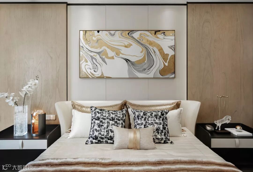 清雅细腻的布艺和点睛的水晶装饰透露出轻奢时尚感;大幅彩色油画与整个空间基调相呼应,提升空间艺术感。